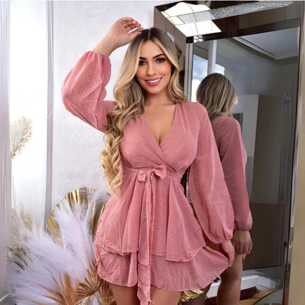 Descubre el encanto y la versatilidad del Vestido Corto de Seda con Manga Larga y Cinturón, diseñado especialmente para la mujer moderna. Su tejido suave y brillante ofrece un toque de sofisticación a tu guardarropa. La falda corta con boleros añade un movimiento encantador, ideal para cualquier ocasión, desde una salida romántica hasta un evento social.